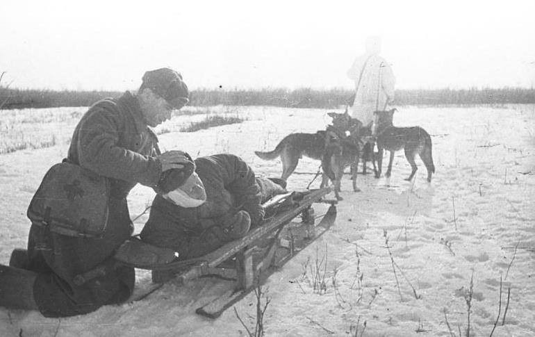 На нартовых, или санитарных, собаках вывозились раненые бойцы непосредственно с поля боя. Зимой – на легких санках, летом – на так называемых волокушах или просто на носилках, поставленных на колеса. Причем вывозили из таких мест, куда не мог подойти никакой другой транспорт. Около 15 тысяч упряжек ездовых собак, участвовавших в войне, вывезли с поля боя 700 тысяч раненых солдат и офицеров. В то время, как санитарам и иным медработникам за вынос с поля боя 80 человек присуждали высшую воинскую награду – звание Героя Советского Союза, четвероногие спасатели довольствовались похвалой да миской с похлебкой.