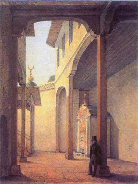 В 1820 году Бахчисарай посетил русский поэт А. С. Пушкин. В связи с именем Пушкина во дворце особое внимание привлекает фонтан Сельсебиль (райский источник). „ Вошёл во дворец, увидел я испорченный фонтан; из-за ржавой железной трубки по каплям падала вода", — так неприглядно описывает Пушкин в письме к Дельвигу тот фонтан, с именем которого связаны его поэма, стихотворение „Фонтану Бахчисарайского дворца" и ряд черновых отрывков. Некоторые заключения о пребывании Пушкина в Бахчисарае можно сделать и на основании поэтических высказываний. В поэме „Кавказский пленник" Пушкин, изображая быт горцев, описал и игры их „светлый Байрам". Мусульманский праздник Курбан Байрам в 1820 году начался 6 сентября, и Пушкин мог наблюдать его как в татарских деревушках, через которые проезжал, так и в самом Бахчисарае. Описывая в „Кавказском пленнике" празднование Байрама, Пушкин, вероятно, и воспользовался некоторыми своими впечатлениями от бахчисарайских народных состязаний. В другой поэме, „Бахчисарайский фонтан", есть несколько строк, рисующих город ночью. Это дает возможность предполагать, что Пушкин и Раевские в Бахчисарае провели ночь, и тогда, конечно, останавливались во дворце, где в те времена для знатных особ отводились для остановки и ночлега комнаты.